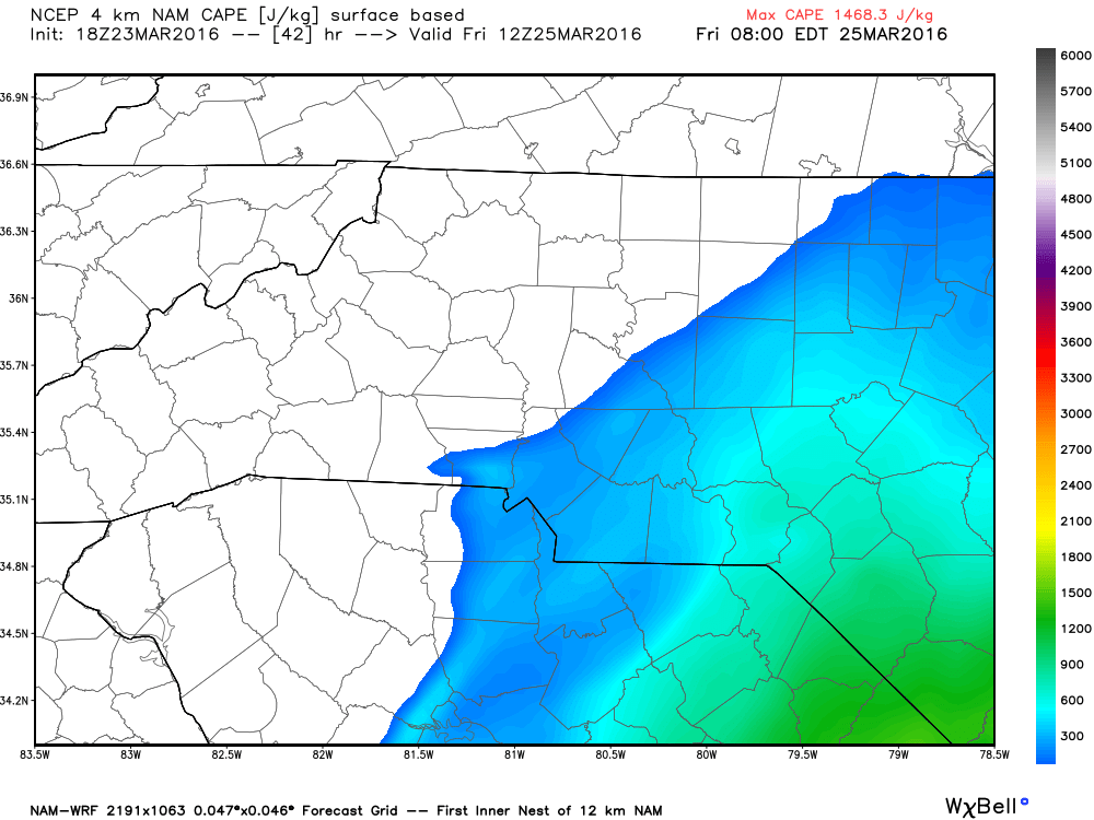 With the CAPE shifting east around 8am Friday Morning any potential storm we have out there will start to diminish pretty quickly as there will jus not be enough steam in the atmosphere at that point to keep these storms firing on all cylinders. Mainly a rain threat at this point and time Friday Morning.