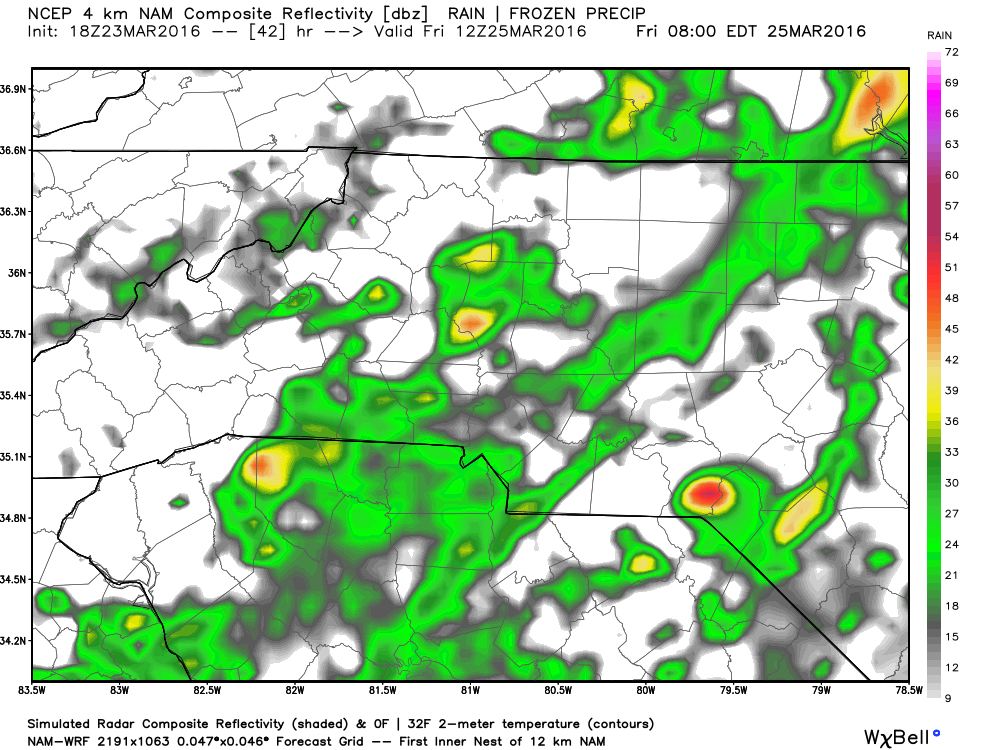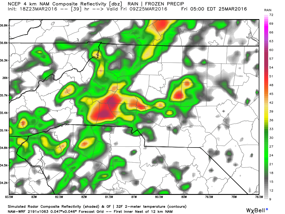 advertise your local business here »Today has been absolutely perfect in terms of weather for the county. Things will start to change over the next 24-38 hours. We will see clouds and showers begin to move in. Not looking for much in the way of severe weather but a few storms as they pass through on Friday Morning could be a little strong. The timing as of right now looks to be between 5am-11am on Friday Morning. Lets take a look at three hours intervals of simulated radar from the North American Model.