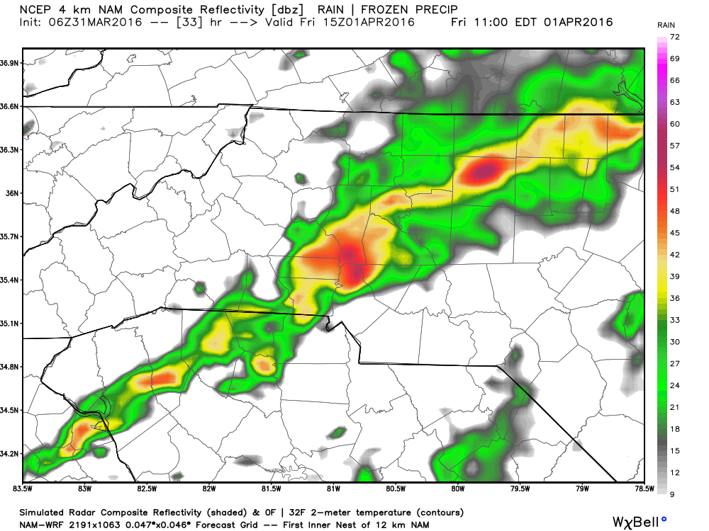 At 10 am Friday morning the models are indicating what appears to be an area of moderate to heavy rainfall and damaging winds that will be just to the west of the county.