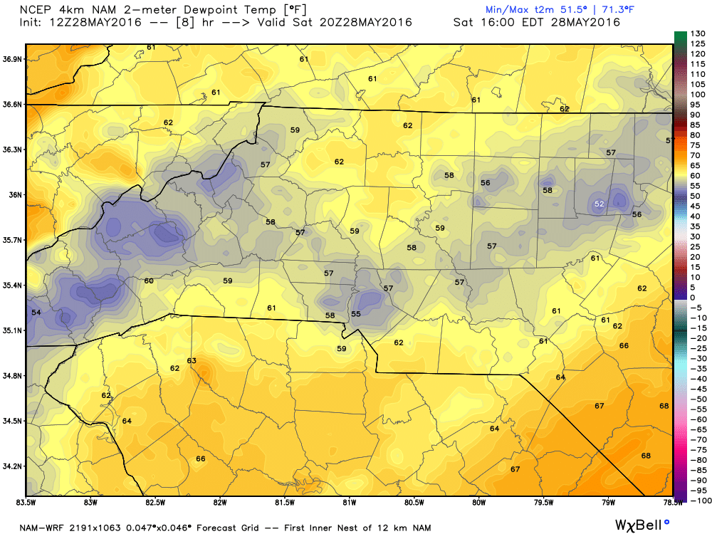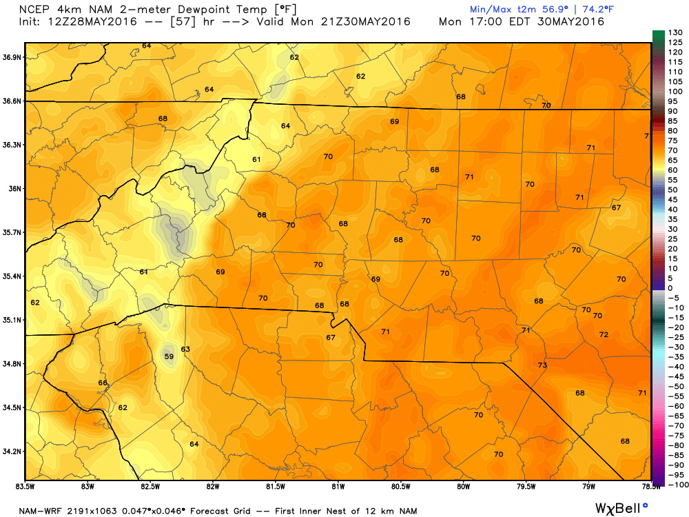 The dew points will be high because of the moisture in the atmosphere. In the upper 60's it will feel a little uncomfortable at times tomorrow so stay hydrated if you are at the track.