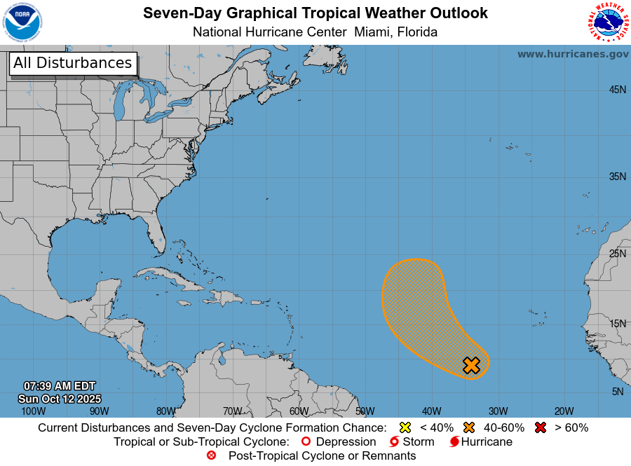 Environmental conditions appear conducive for some development during the next few days, and a tropical depression could form early or midweek as the system moves west-northwest to northwest at 15 to 20 mph across the central tropical Atlantic.