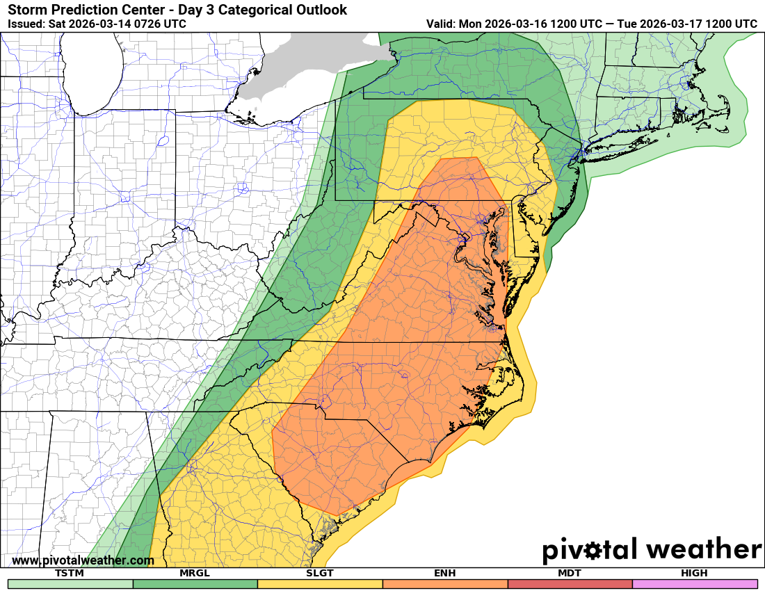 The risk area stretches from the Carolinas northward through Virginia and into parts of the Mid-Atlantic.