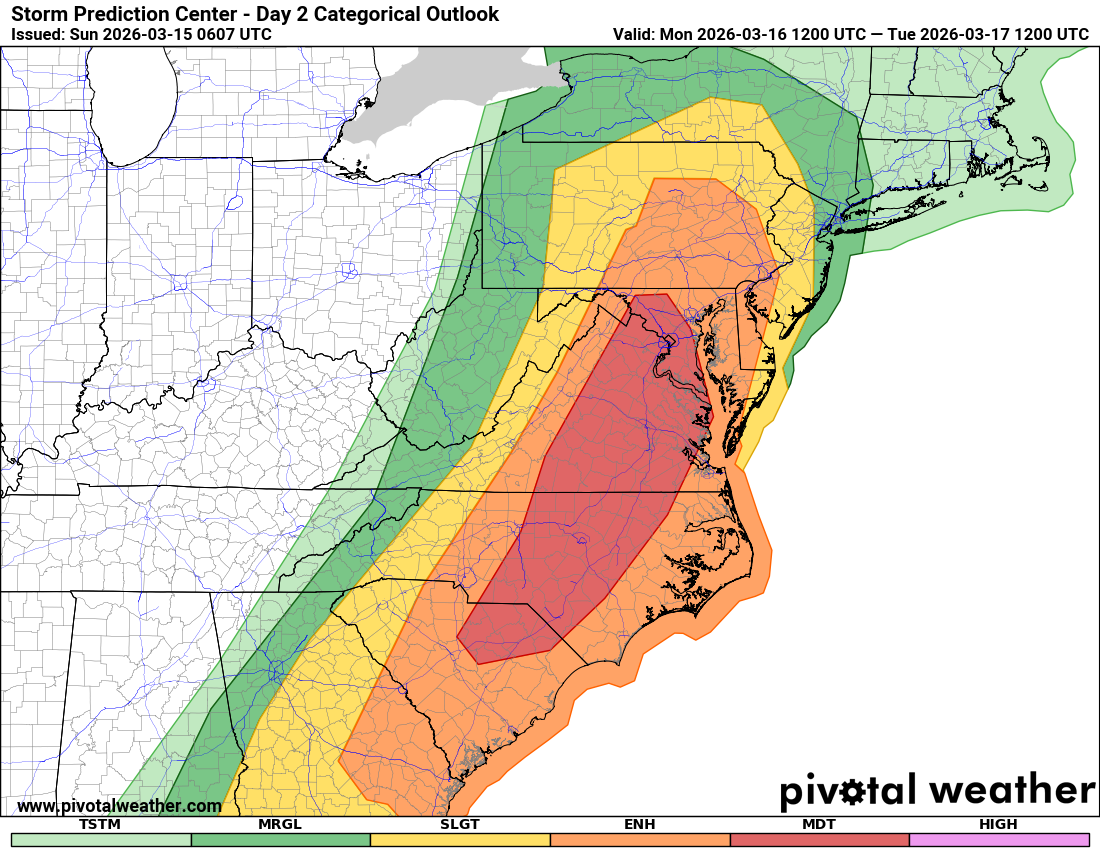 A significant severe weather event is expected to develop across the Carolinas and Mid-Atlantic on Monday as a powerful storm system moves across the eastern United States.